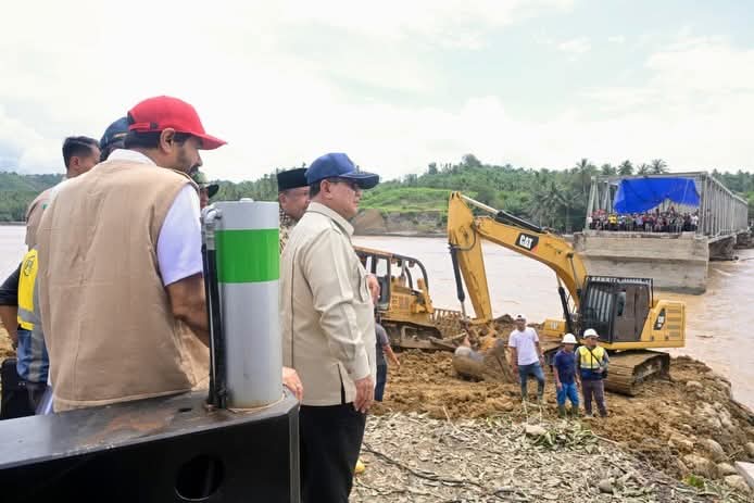 Setibanya di lokasi, Presiden Prabowo langsung menuju titik konstruksi yang berada di tepi aliran sungai. Ia juga menyaksikan dari dekat proses pemasangan struktur baja serta operasi alat berat yang dikerahkan untuk mempercepat penyelesaian jembatan.